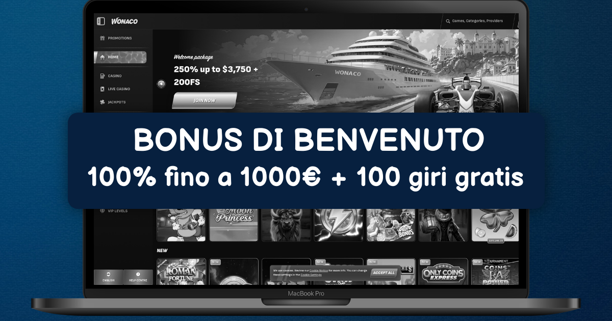 Wonaco Casino accoglie i nuovi giocatori con un pacchetto di benvenuto davvero generoso, strutturato per massimizzare il divertimento sin dai primi depositi.